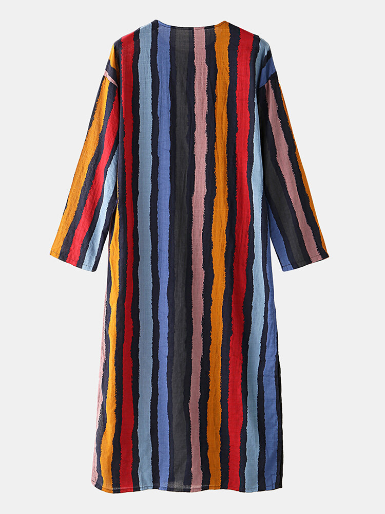 Robes - Mens Colorful Striped Double Pocket Side Split Home Casual Long Sleeve Sleepwear Robes