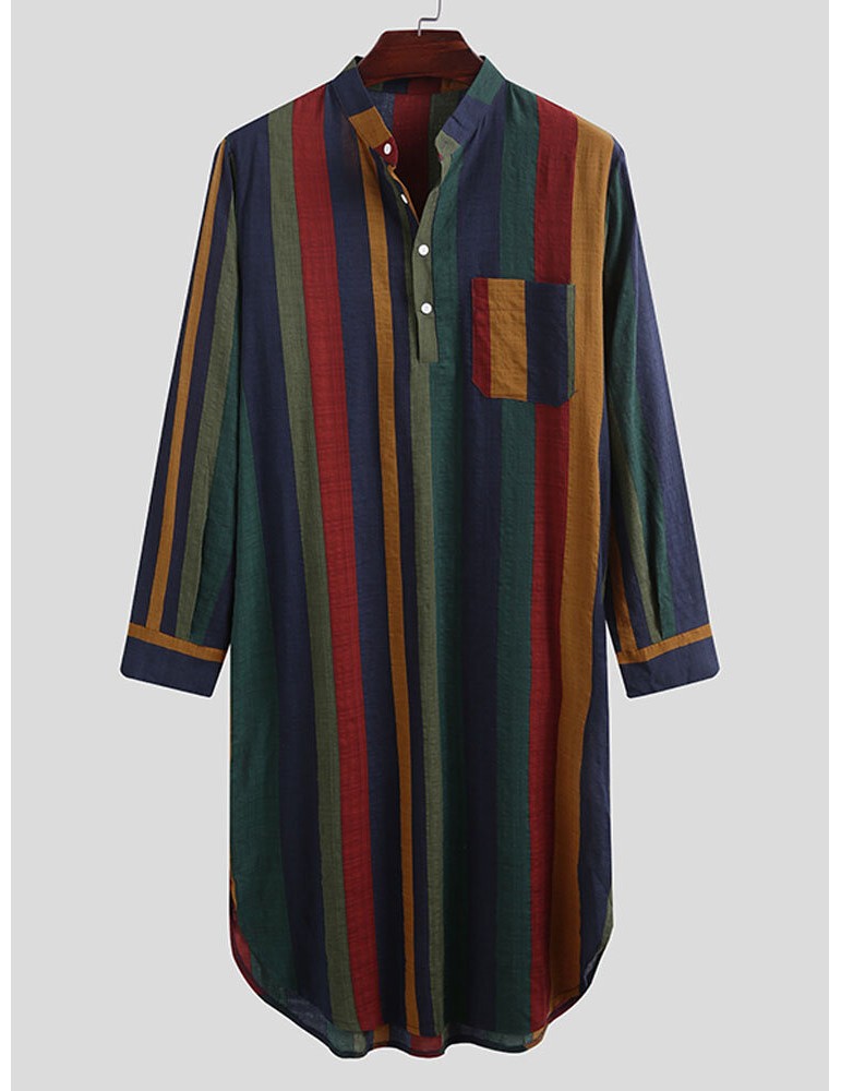 Robes - Mens Cotton Striped Print Chest Pocket Henley Collar Long Sleeve Home Pajama Robes